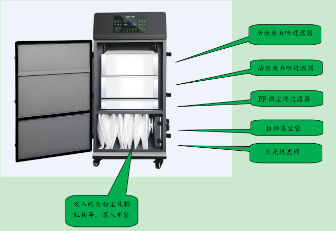針對激光打標(biāo)、激光雕刻切割、激光焊接焊錫、拋光打磨、等場合所產(chǎn)生的煙霧、粉塵、以及少量異味、有毒有害氣體進(jìn)行綜合凈化過濾。